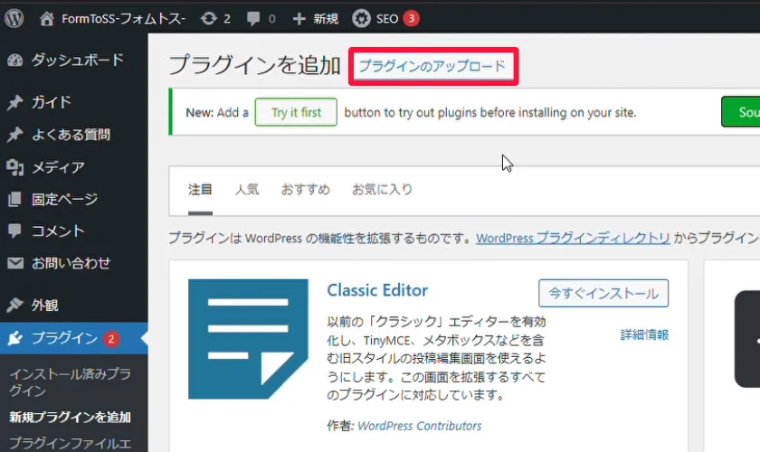 FormToSSの利用には、プラグインのインストールが必要です。 WordPressプラグインのインストール方法は、主に2つあります。