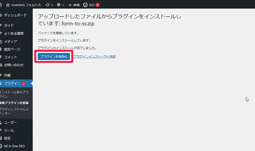 5.インストールが完了したら、「有効化」ボタンをクリックしてプラグインを有効化します。