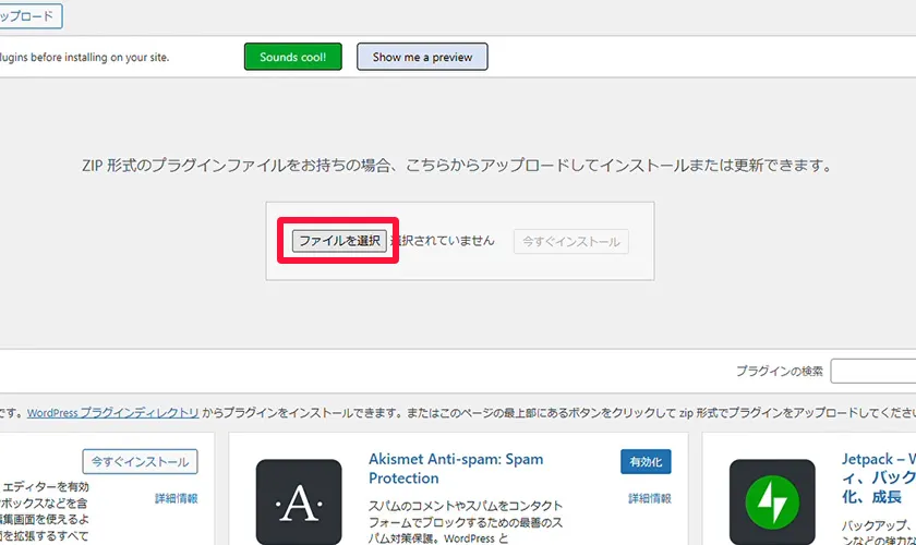 5.「ファイルを選択」ボタンをクリックし、ダウンロードした.zipファイルを選択します。