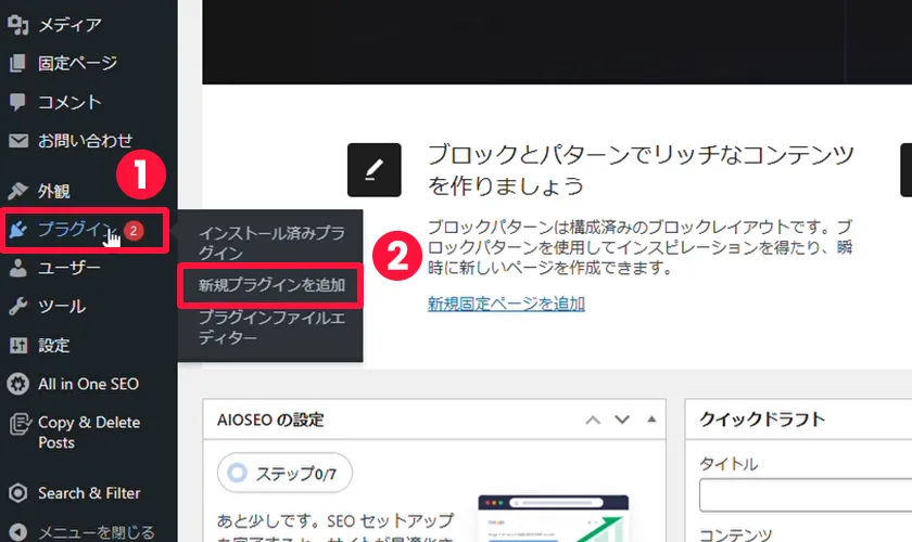 2.左側のメニューから「プラグイン」>「新規追加」を選択します。